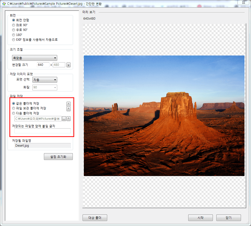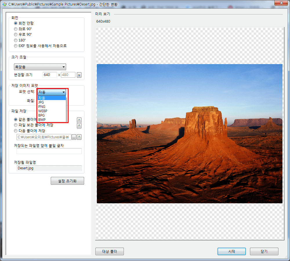 15. 이미지 포맷을 JPG, PNG, WEBP, BPG, BMP로 변경이 가능하고 수정된 파일의 폴더와 이름 변경도 가능합니다.