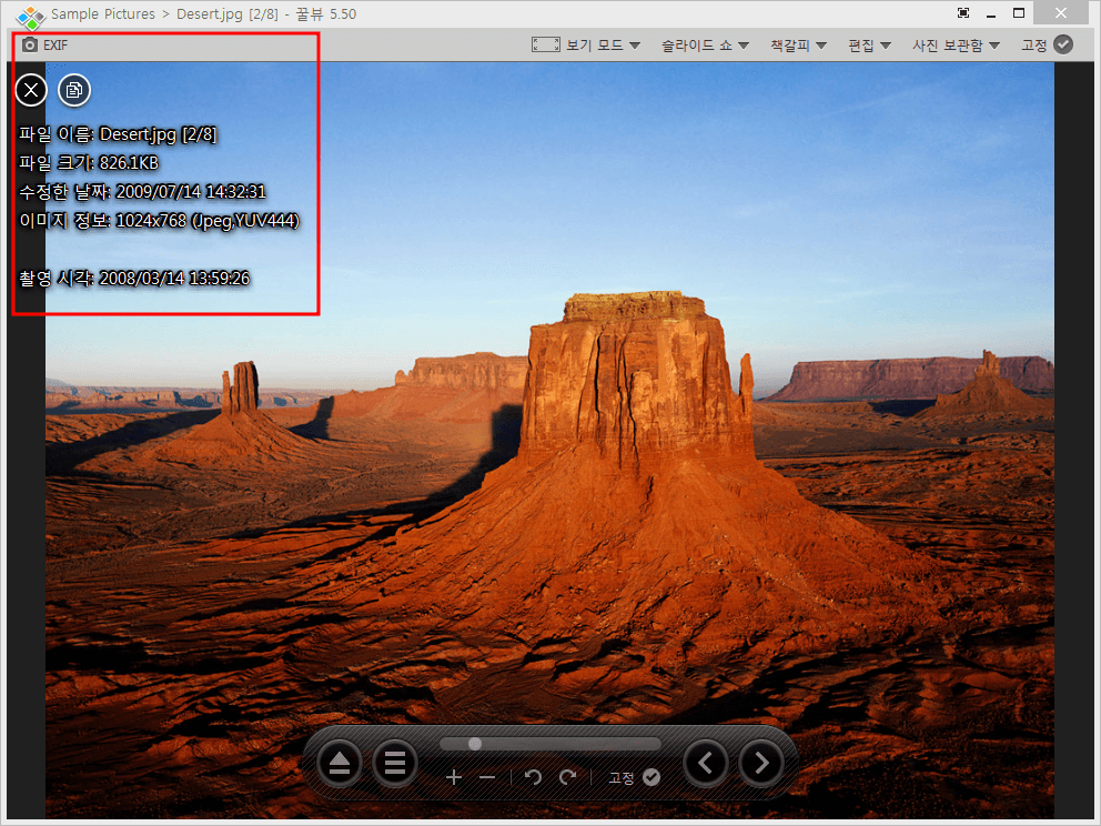 3. 꿀뷰 우측 상단의 [EXIF]를 클릭하시면 이미지의 다양한 정보를 확인할 수 있습니다.
