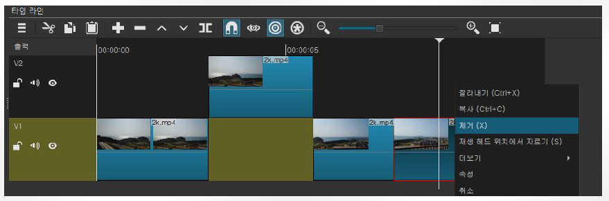 5. 분할된 동영상 구간을 추가된 비디오 트랙으로 이동시킵니다. 마우스를 드레그하여 이동할 수 도 있으며, Ctrl+c/v, Ctrl+x, Ctrl+z/y의 편집 기능을 이용할 수 도 있습니다.