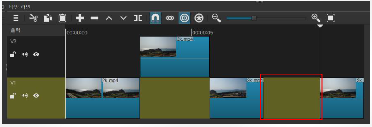 6. 불필요한 동영상 구간은 키보드 Delete 버튼을 누르면 삭제할 수 있습니다. 단 삭제된 영역은 아래의 그림처럼 빈 공간으로 남게 됩니다.