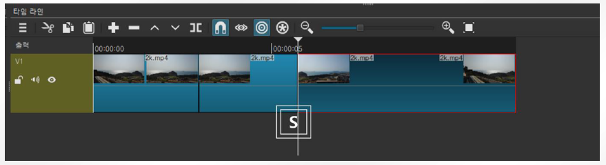 3. 편집을 원하는 곳으로 마우스로 화살표를 이동시킨 후 키보드 s버튼을 누르면 화면이 분할되어집니다. 화살표를 이동시키면 s버튼을 누르시면 동영상이 구간으로 쪼개집니다.