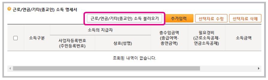 7. 제출된 근로.연금.기타소득 지급명세서가 있는 경우, 근로/연금/기타(종교인) 소득 명세서 항목 우측에 [근로/연금/기타소득 불러오기] 버튼을 클릭하면 원천징수의무자가 제출한 지급명세서 등의 자료를 불러올 수 있습니다.