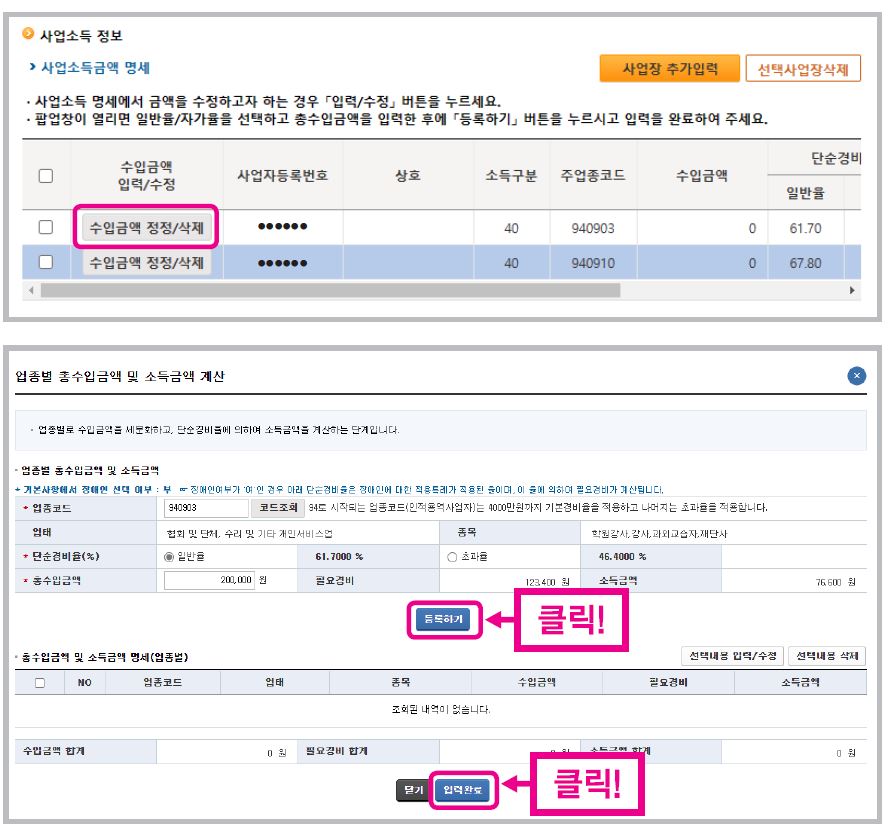 "등록하기"버튼을 클릭하면 계산된 금액이 총수입금액 및 소득금액 명세에 등록됩니다.