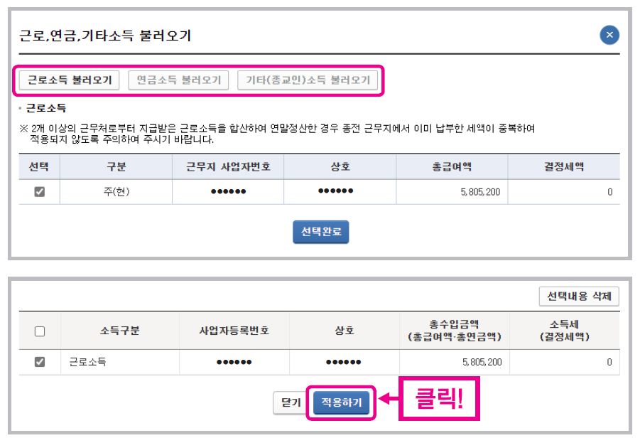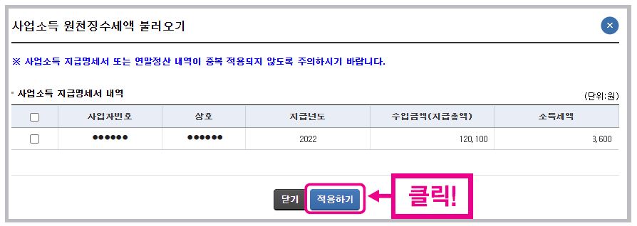 입력한 사항과 원천징수 또는 납세조합징수세액 소득세 합계금액이 맞으면 [적용하기]를 클릭합니다.