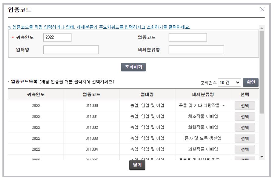 사업자번호가 있는 경우 사업자등록번호 “있음”으로 선택하고 사업자 번호 입력 후 [조회]를 누릅니다. 업종코드를 모르는 경우 주업종코드의 [업종코드 찾기] 버튼을 클릭하여 해당 업종을 선택 입력합니다.
