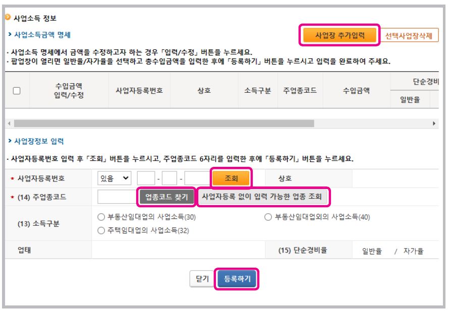 5. 사업소득금액 명세 상단 우측에 [사업장 추가입력] 버튼을 클릭하여 사업장정보 입력 항목에 입력하고 [등록하기] 버튼을 누르면 사업소득금액 명세에 추가됩니다.