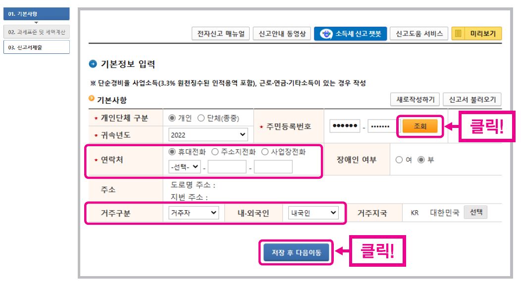 3. 주민등록번호 항목에 [조회] 버튼을 클릭합니다. 연락처에 휴대전화, 주소지전화, 사업장 전화 중 하나를 선택하여 입력하고 기본사항에 거주구분, 내·외국인 확인합니다. 이상이 없으시면 [저장 후 다음이동]을 누릅니다.