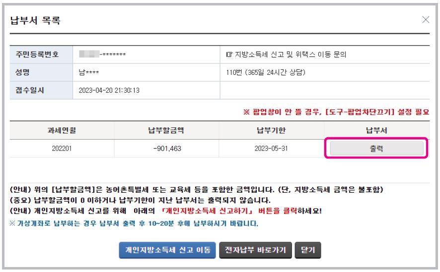 18. 납부서를 조회하고 확인하고 싶으신 분들은 납부서 항목에서 [출력] 버튼을 클릭합니다.