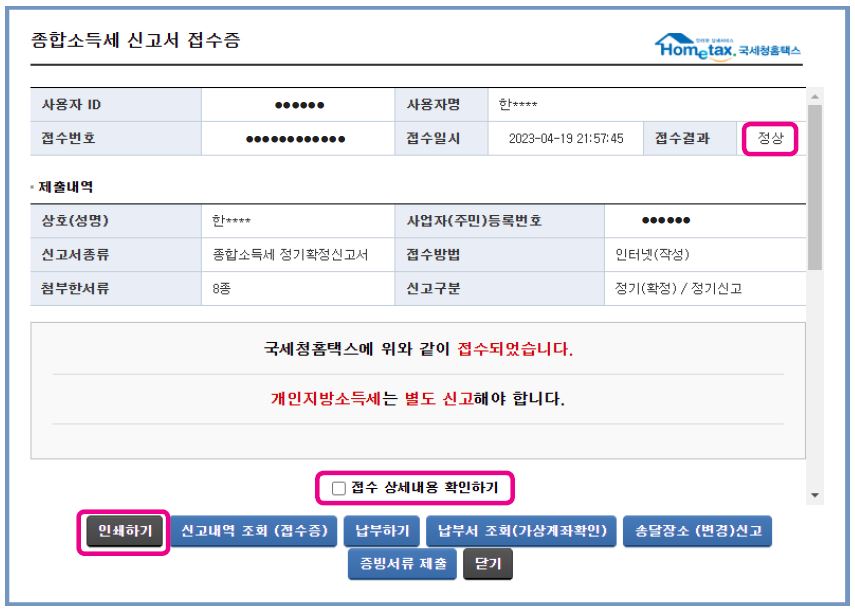 16. 종합소득세 신고서 접수증이 화면에 보이면, 접수 결과 상태가 정상으로 나타나며, 인쇄하실 분은 [인쇄하기] 버튼을 클릭하면 됩니다.
