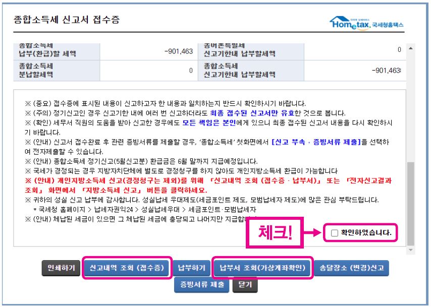 하단에 “접수 상세내용 확인하기”를 체크하거나 접수증 화면을 아래로 스크롤하면 접수증 상세내용 확인이 가능합니다.
