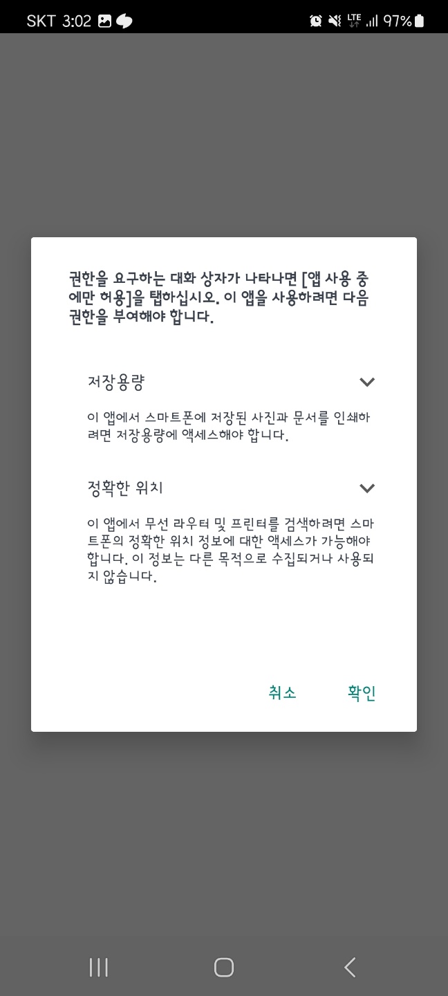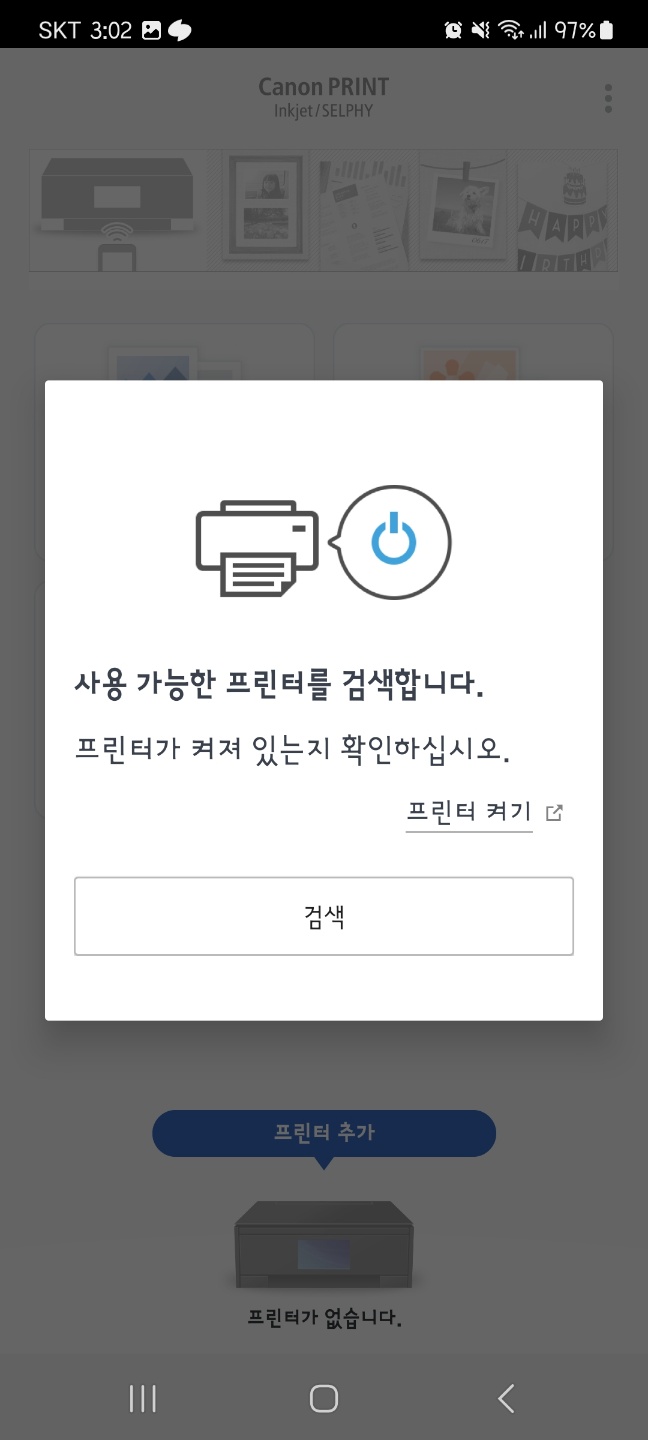4. 앱 화면의 설명에 따라 확인을 클릭하고 사용가능한 프린터를 검색합니다. 프린터는 반드시 전원을 켜세요.