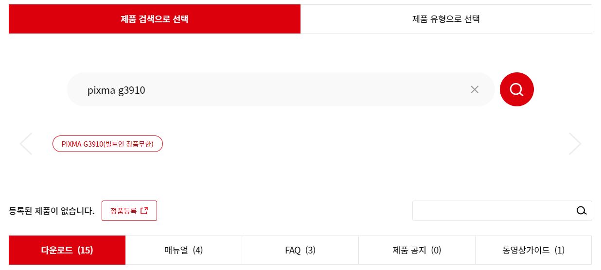 1. 보유하고 계신 캐논 프린터의 제품명을 입력합니다. (예: PIXMA G3910)