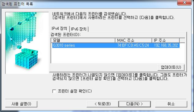 7. 검색된 프린터에서 사용하려는 프린터를 선택하고 다음을 클릭하면 드라이버 설치가 완료됩니다.