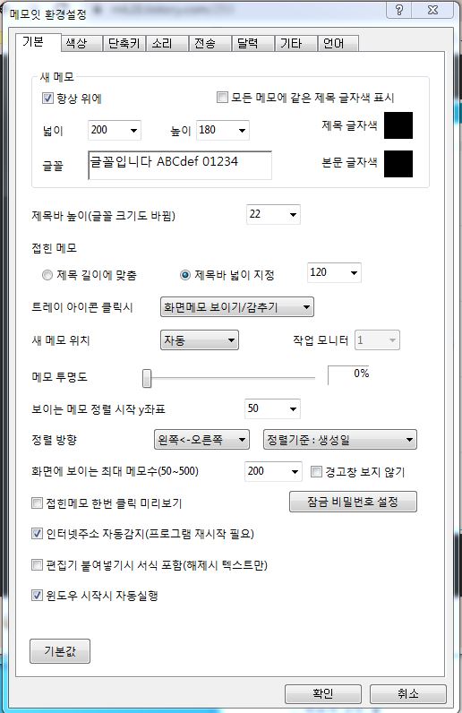 - 환경설정(기본, 색상, 단축키, 소리, 전송, 기타 설정)