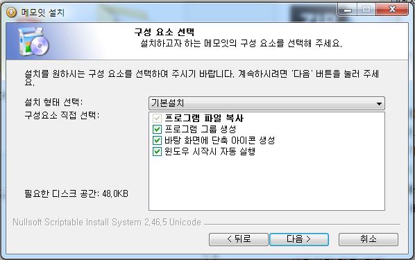 3. 설치하고자 하는 메모잇의 구성 요소를 선택합니다. 원도우 시작 시 자동실행이 필요 없으시면 체크를 제거한 후 다음을 클릭하세요.