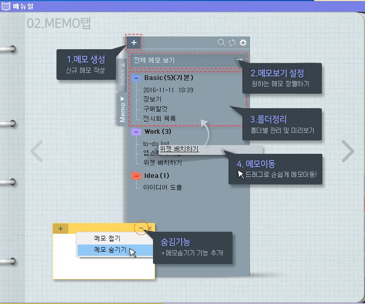 메모관리 : 중요 메모, 색상, 폴더별로 손쉽게 정리하고 한 눈에 확인이 가능합니다.