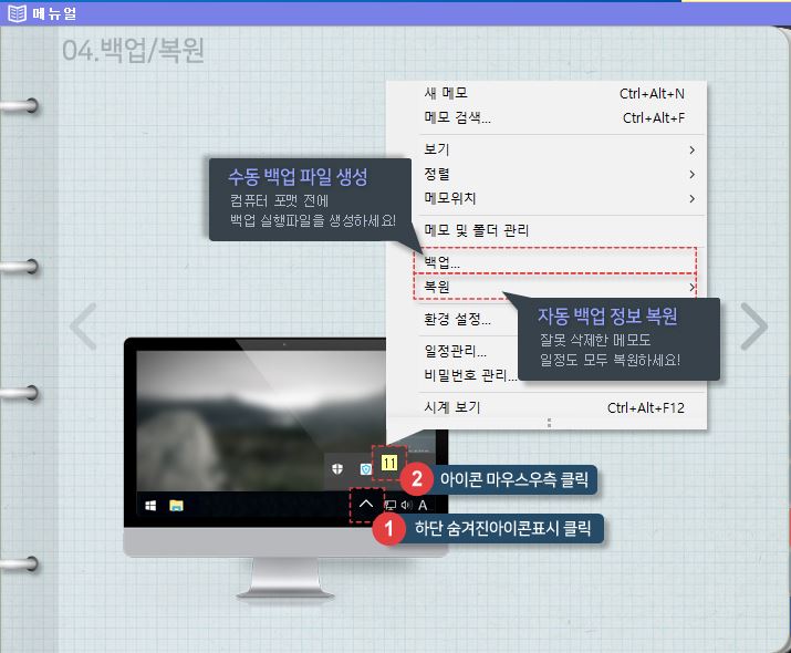 1. 컴퓨터 포맷 전에 백업 실행파일 생성을 통하여 수동으로 메모를 백업할 수 있습니다.