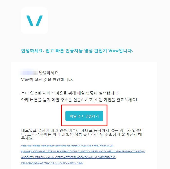 3. 메일함을 확인해 보시면 Vrew에서의 인증 메일을 확인할 수 있습니다. [메일 주소 인증하기]를 클릭하시면 메일 인증이 완료되었다는 창이 나타납니다. Verw로 돌아가셔서 [가입 완료]를 클릭하여 회원가입을 마무리하세요.