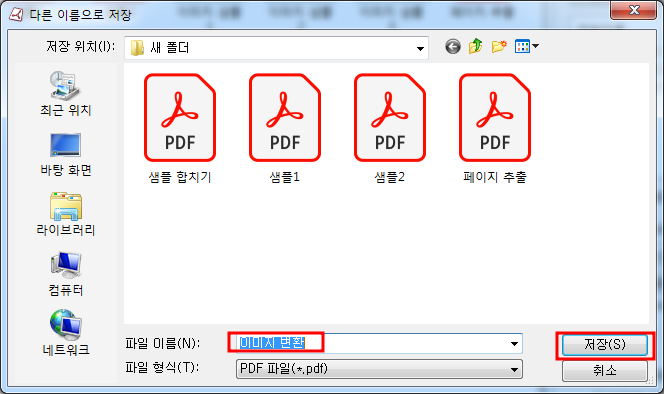 4. 변환될 PDF의 폴더 위치와 파이 이름을 지정하신 후 [저장]을 클릭하세요. 이미지 파일을 PDF 변환하기가 실행됩니다.