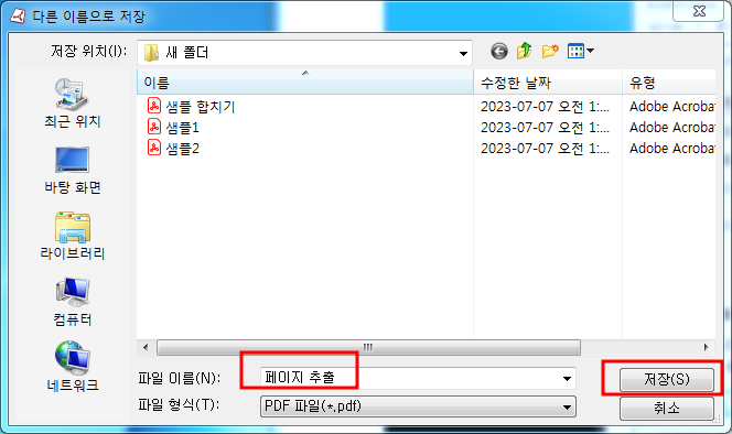 4. 폴더 위치와 새로 생성되는 PDF파일의 이름을 작성한 후 [저장]을 클릭하면 PDF 페이지 추출하기가 실행됩니다.