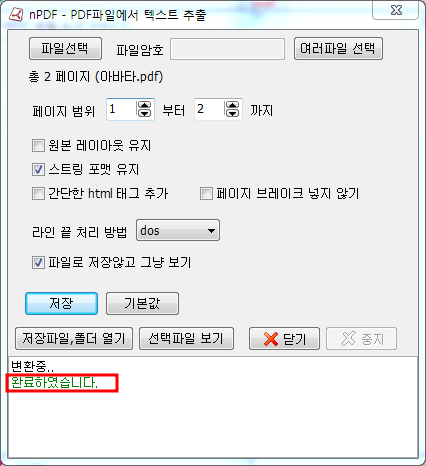 4. 실행창 하단에 '완료되었습니다'와 동시에 메모장이 열리면서 추출된 텍스트 나타남을 확인할 수 있습니다.