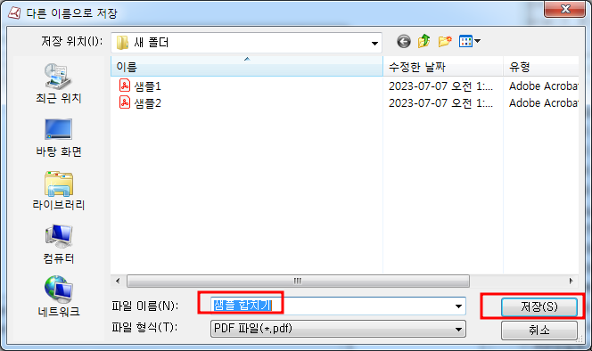4. 합치고자 하는 PDF의 폴더 위치와 파일 이름을 작성한 후 [저장]을 클릭하면 파일 합치기가 실행됩니다.